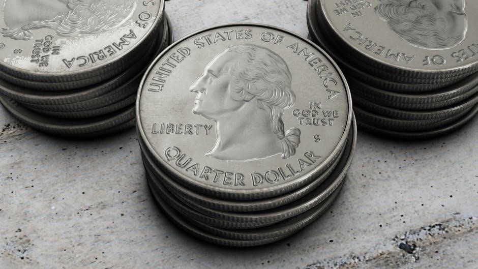 Certain state quarters are highly valuable due to unique errors or limited production. The 2004 Wisconsin quarter with an extra leaf is among the rarest, worth up to $1,500. Similarly, the 1999 Delaware quarter featuring a spinning wheel error can fetch up to $25,000. These coins, along with others like the 2005 Minnesota quarter with an extra tree, are sought after by collectors. The state quarter checklist PDF helps identify such rare finds, making it easier to track and evaluate valuable additions to a collection. These quarters stand out for their distinct errors and historical significance, adding prestige to any collector’s portfolio.